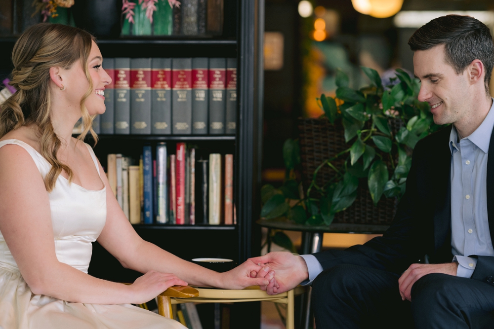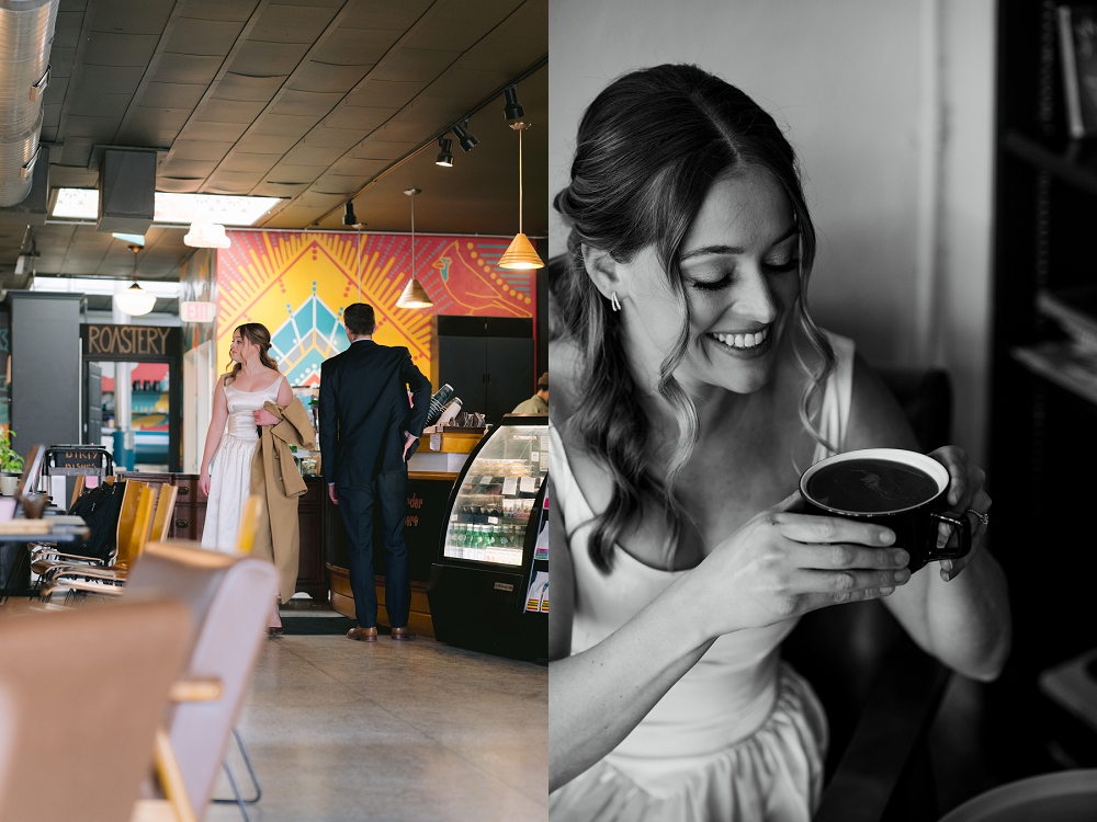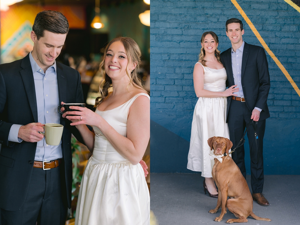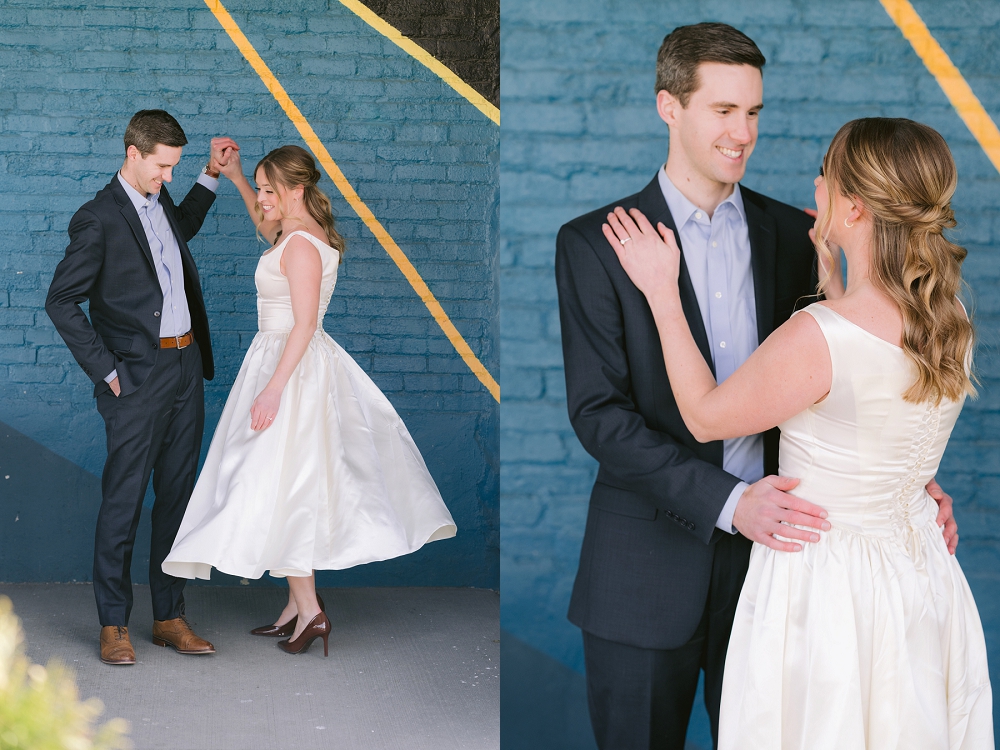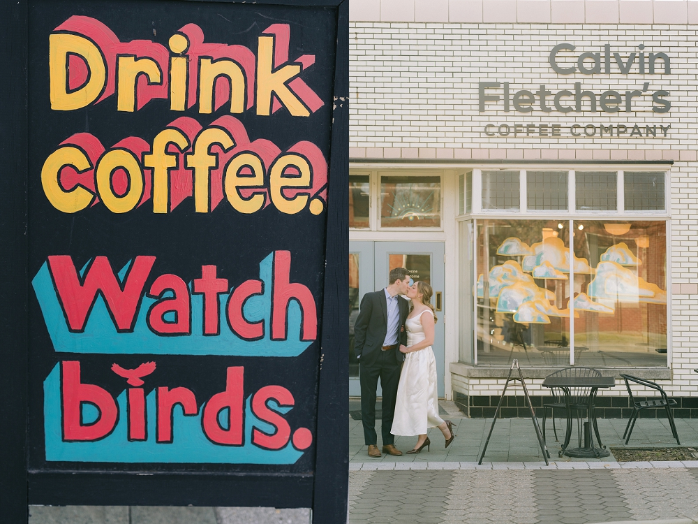 Ali and Matt’s pre-wedding portraits in Fountain Square, Indianapolis, perfectly captured the essence of their love story. The vibrant, artistic neighborhood set the stage for their intimate photoshoot, with its eclectic mix of street art and vintage charm. It was in this very area, at Calvin’s Coffee Shop, where their journey began. Ali and Matt first crossed paths over a shared cup of coffee, and now, years later, they were able to celebrate that special moment with a personalized pre-wedding session as well as their wedding in downtown Indy at the Heirloom at NK Hurst Building. As an Indianapolis wedding photographer, capturing these moments in a unique setting made for stunning and colorful photos.